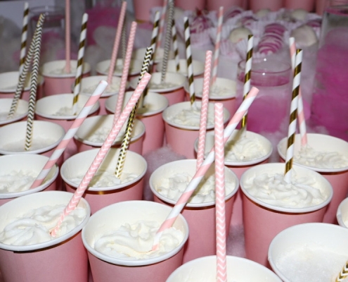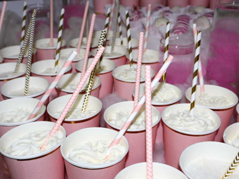 Cups filled with honey lemon glazed shrimp.
